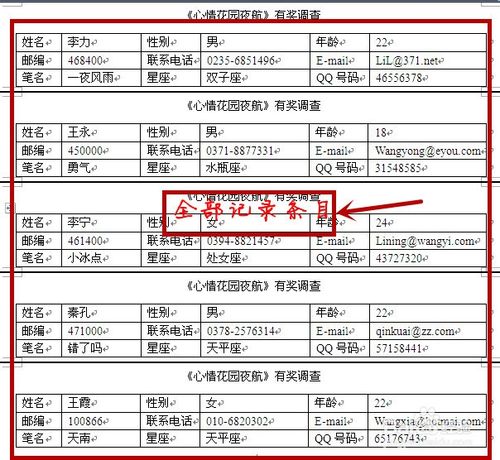 7.点击“下一步”完成邮件合并---完成合并,已经可以使用“邮件合并”生成信函----点击“编辑单个信函”---选择合并全部记录。左边可以看到,记录的全部内容。此时就可以打印,需要的内容。