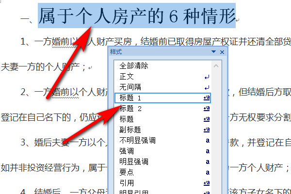 3.选定的标题,点击样式中的“标题1”,标题马上更改了格式,同样的方法将其他几个标题都选中,点击样式中的“标题1”,此方法就是将章的标题样式改为标题1的样式。