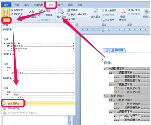 4、设置后,将光标放在生成的目录上,单击引用---->更新目录;