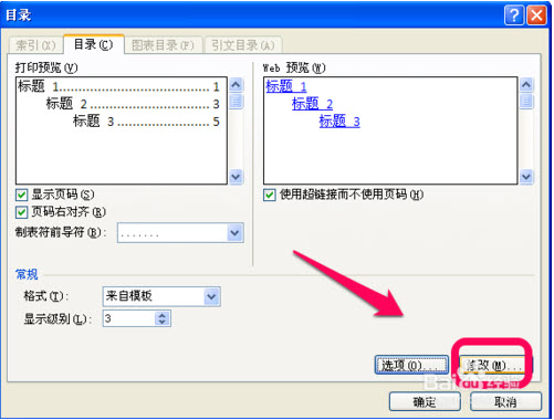 2、插入目录的设置弹出框后,点击右下角的修改,如图。