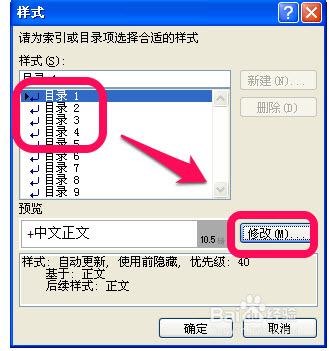 3、然后,就看到目录1、2、3,......,选择需要修改的目录级别,然后点击修改,如图。