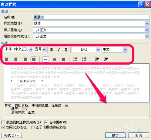 4、进入修改样式页面,可以进行如图所标示的很多字体格式的修改,修改完成后,点击确定即可。