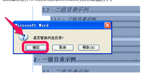 6、对每一级别的目录进行设置修改后,点击确定后,会弹出替换的提示框,点击确定,就把默认的word目录格式替换成自己设置的了。