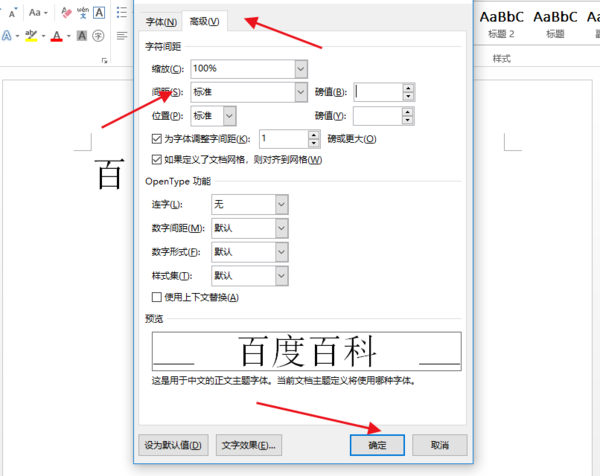 3、在弹出的字体窗口中,选择高级模块,并将间距更改为标准,最后点击下方的确定按钮。