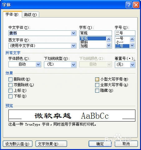 在“字体”选项组中选择“字体”下拉列表框中的“隶书”选项选择“字号”下拉列表框中的“二号”选项,如图所示。