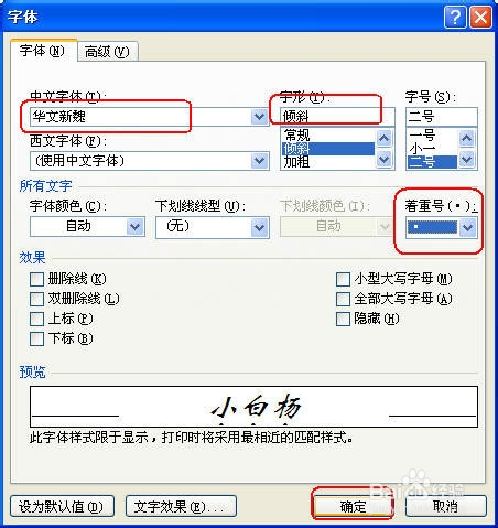 在【字体】对话框中,选择中文字体为【华文新魏】选项;在【字形】列表中选择【倾斜】选项,并单击【着重号】下拉按钮,选择着重符号,单击【确定】按钮即可,如图所示。