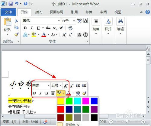 浮动工具栏是用户在选择文本时,文档中显示或隐藏的一个方便、微型、半透明的工具栏。在该工具栏中,单击【以不同颜色突出显示文本】下拉按钮,选择“黄色”色块,如图所示。