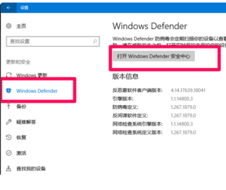 2、点击“更新与安全”,点击”Windows Defender”,选择“打开Windows Defender安全中心”。