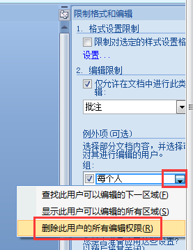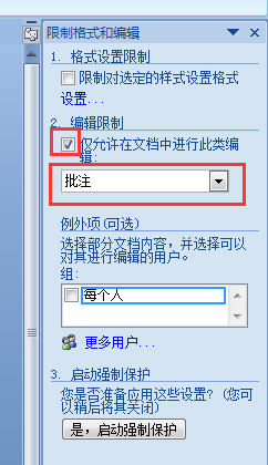 2、设置了内容保护(批注):审阅--保护--保护文档,在“限制格式和编辑”窗口,选中“编辑限制”下的“仅允许在文档中进行此类编辑”,然后按下拉按钮,选择“批注”,如图: