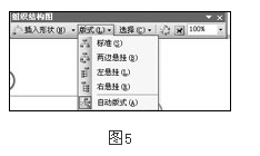 3、如果不满足于默认的效果,可以在“组织结构图”工具栏上选择“自动套用格式”,其中给出了除“默认”外的16种效果,一定可以满足你的要求了。如图4所示。另外,在“版式”中除了标准样式外,还提供了两边悬挂、左、右悬挂等可以供进行选择。如图5所示。