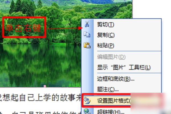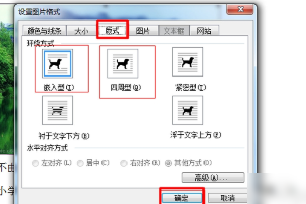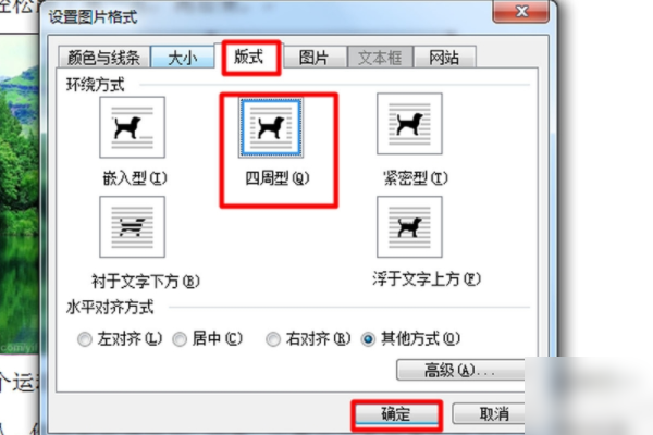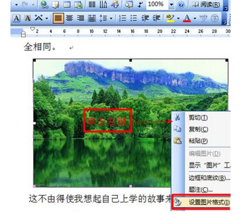 2、在图片中央单击右键--设置图片格式。然后选择【版式】。在版式下方选择你需要的环绕方式。到这里方法就比较多了。看你,也可以利用本身的排版直接排版即可。