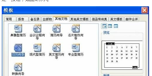 2.打开“模板”对话框,单击“其他文档”选项卡,选中“日历向导”选项,单击“确定”按钮,如图1所示。