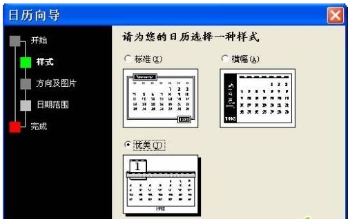 3.弹出“日历向导 模板,选择自己想要的样式及方向。这里选择“优美”样式,然后单击“下一步”按钮,如图2所示。