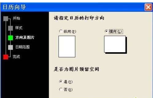 4.选择日历的方向和是否为图片预留空间,这里选择“横向”和“是”单选按钮,然后单击“下一步”按钮,如图3所示。