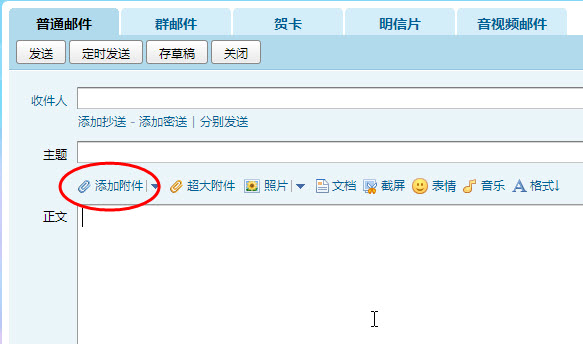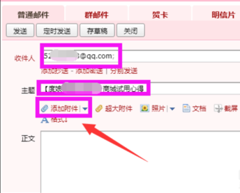 填写收件人的邮箱地址,主题,然后内容输入框中输入你要发送的文件的一些说明。填写完成后,点击添加附件按钮;