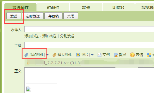 在收件人中填写需要发送的邮箱地址,选择添加附件,选择压缩的rar程序。点击发送即可。如下图: