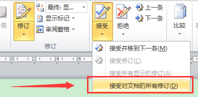 2、解除修订模式后,word文档中已经修订的部分并不会更改,只是不会再重新产生新的修订,此时在“审阅”选项下,选择“更改”窗口的“接受”键,点击“接受”键的下拉菜单,在菜单中选择“接受对该文档的所有修订”,点击后,文章中的全部修订皆被认可,不会再产生文字上面划横线的情况了。