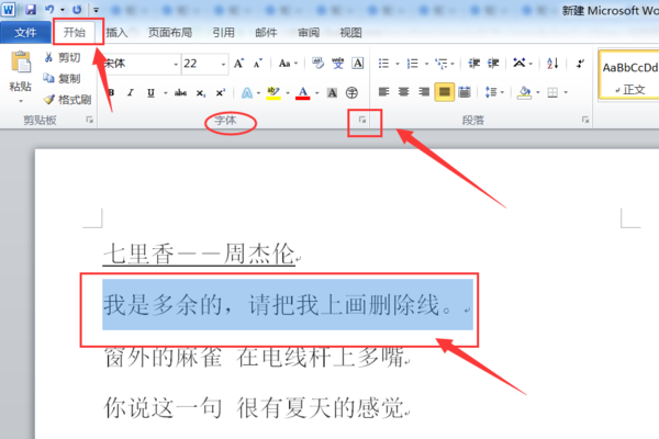 1、打开需要操作WORD文档,鼠标选中需要添加删除线的文字,在“开始”选项卡中找到“字体”一项,点击右下方的按钮,进入字体设置页面。