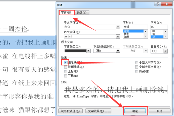2、在字体设置界面,点击效果“删除线”前面的小方框,打上勾勾,然后点击“确定”按钮即可。