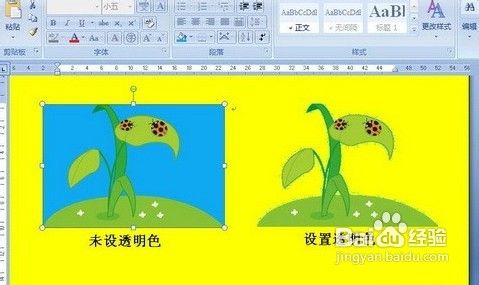 2、鼠标箭头呈现彩笔形状,将鼠标箭头移动到图片上并单击需要设置为透明色的纯色背景,则被单击的纯色背景将被设置为透明色,从而使得图片的背景与Word 2007文档的背景色一致