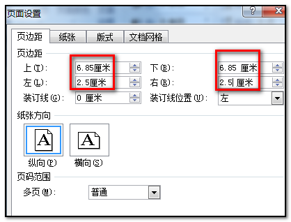 4、在弹出的对话框中,需要对上下、左右的边距进行设置,若需要对图片的高度设置为16厘米的话,上、下页面局的数值设置为:(29.7-16)/2=6.85厘米;同理若要对宽度设置为8厘米的话,左右的边距设置为:(21-10)/2=2.5厘米;