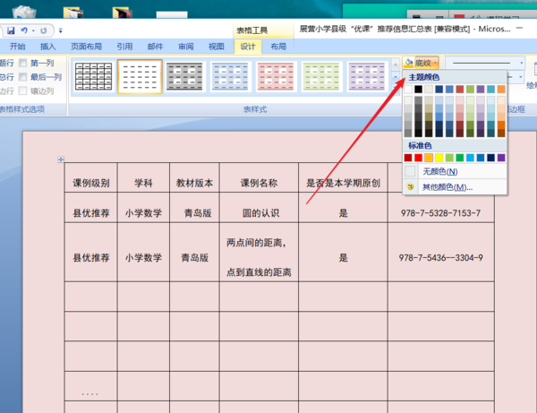 4、我们还可以点击箭头所指的底纹按钮对表格的底纹颜色进行更改。