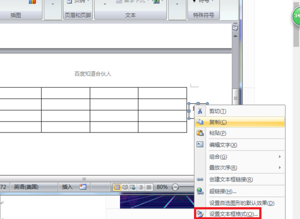 5、然后拖动文本框到表格侧边合适的位置,点中文本框,利用鼠标箭头,根据需要调整文本框小大与方向。然后点击其右键菜单中的“设置文本框格式”选项。
