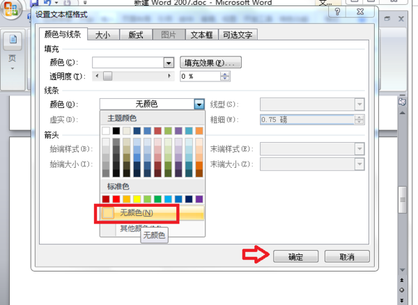 6、然后“颜色与线条”的页面中将线条颜色设置为“无颜色”,然后点击“确定”按钮。