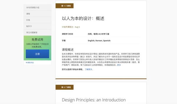从《以人为本的设计:概述》到《设计原则介绍》到《用户体验:研究与原型》…最后还有交互设计的毕业项目提交。全部学完你就是专业出身的设计师了!还可以获得结课证书放在简历里(该项需要额外付费)。