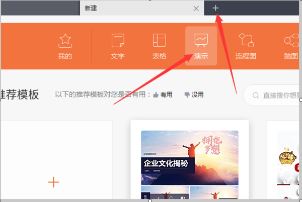 2、打开Word软件后点击页面上方的新建选项。新建一个演示文件。