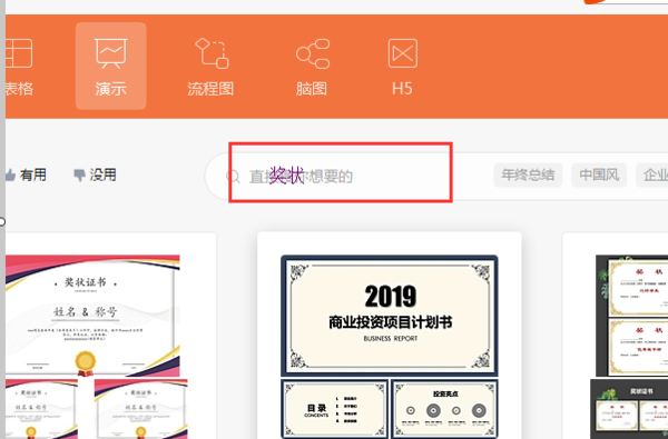 3、在搜索框中输入奖状然后按下键盘上的回车键搜索奖状模板。