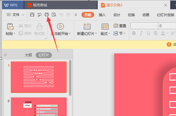 5、进入演示文档页面后点击页面左上方的打印选项进入打印设置界面。