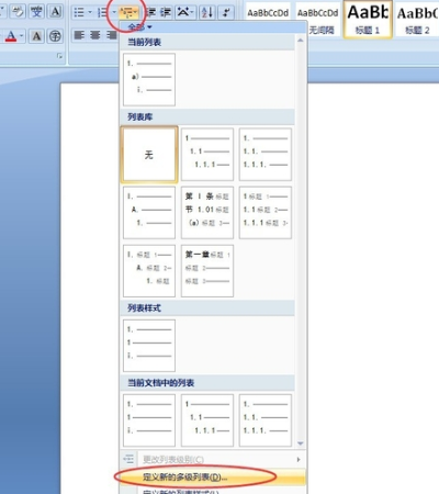 2、然后我们在该页面中点击上分“多级列表”选项中的“定义新的多级列表”选项。