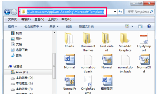 4.复制对话框中的word模板文件路径“C:\Users\acer\AppData\Roaming\Microsoft\Templates”。