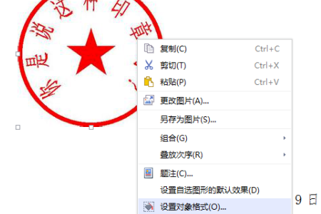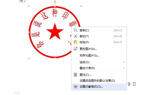 3、插入盖章之后,我们右键单击图片选择打开“设置对象格式”。