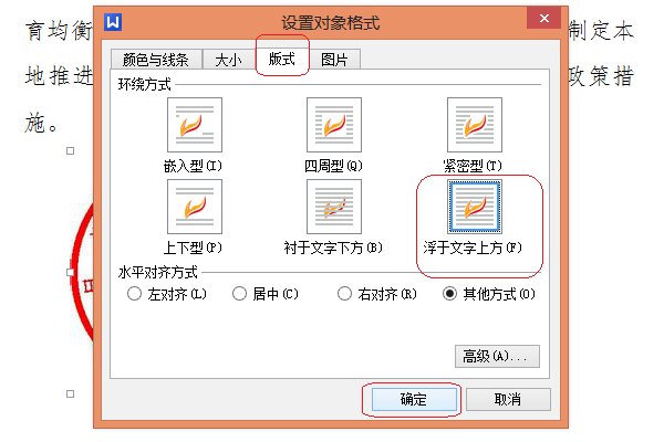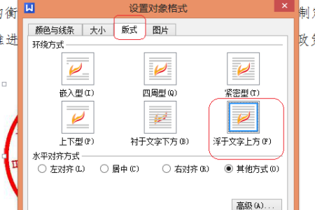 3、点击“版式”,环绕方式选择“浮于文字上方”,水平对齐方式 选择“其他方式 ",点击”确定“。