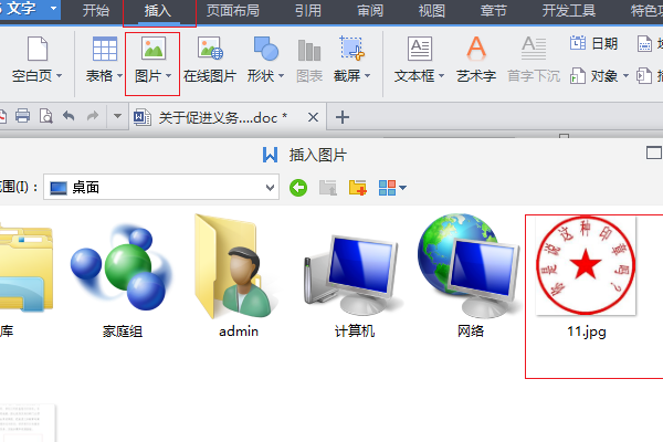 1、打开wold,点击”插入“,选择"图片”找到存储电子印章的文件夹,选中“电子印章文件”点击“打开”。