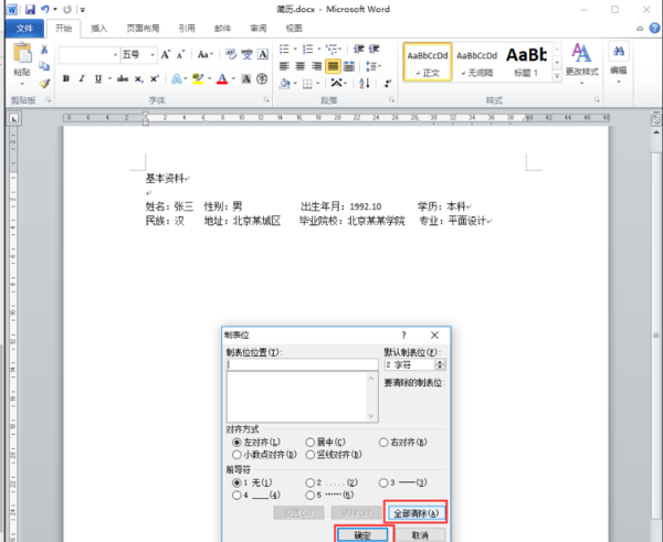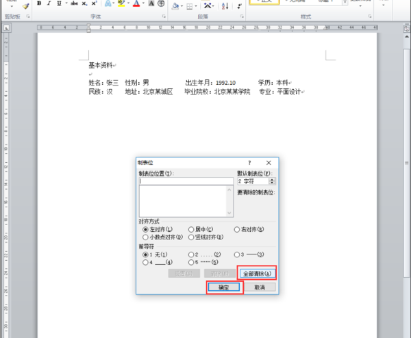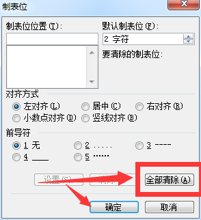 5、在弹出的“制表位”对话框点击全部清除按钮,在点击确定,完成清除。