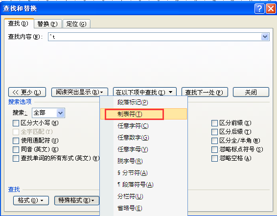 2、弹出查找和替换对话框,单击特殊格式按钮,在弹出选项中选择制表位;