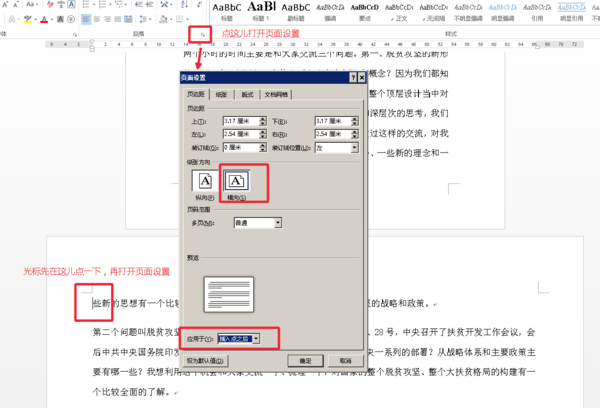 在“方向”里选择需要的特定的纵向或者横向后,再在下面的“预览”下的“应用于”里选择“插入点之后”,最后点击“确定”即可。