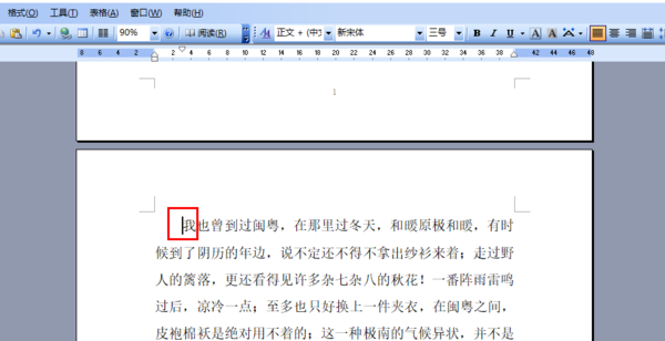 第二步,把鼠标调整回第一页最后一行,左键单击。这时光标呈竖条一闪一闪的。