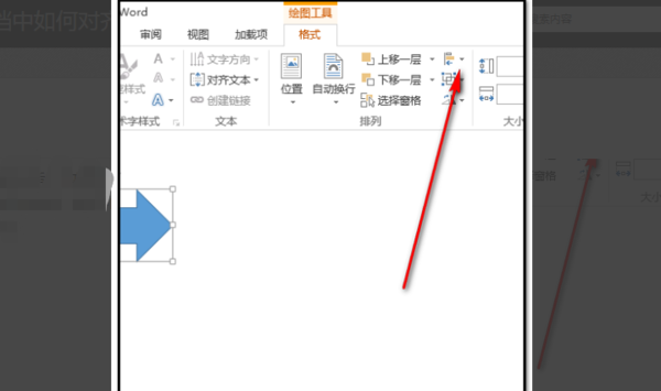 3、点“格式”选项卡后,下方显示了相关的功能区;在“排列”组这里,在如下图箭头所指的小三角点下。