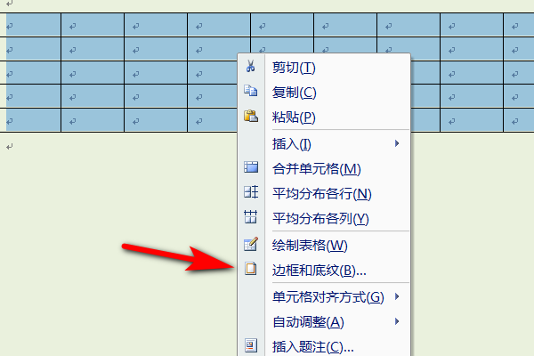 2.进入到word文档页面之后,选择表格,鼠标右键单击后选择边框和底纹进入。