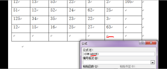 3、进入公式计算面板,在第一个框中输入““=SUM(ABOVE)”,如下图所示。