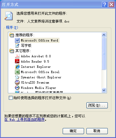 随便找个WORD文档,右键点击—打开方式—选择程序—列表里找到WORD。下边那个始终使用选择的程序打开文件前面勾选。