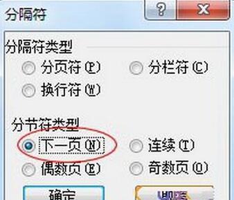 2、选择“插入-分隔符”,打开“分隔符”对话框,在“分隔符类型”下单击以选中“下一页”复选钮。