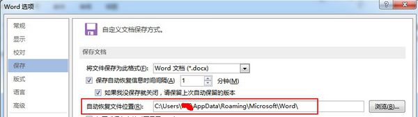 2、弹出Word选项对话框中,选择“保存”,在自动恢复文档位置右侧,单击浏览可以查看,如图所示。