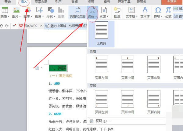 2、光标还是在第二页首字符处,在“插入”菜单下,有个“页码”选项,选择“页面底端”。