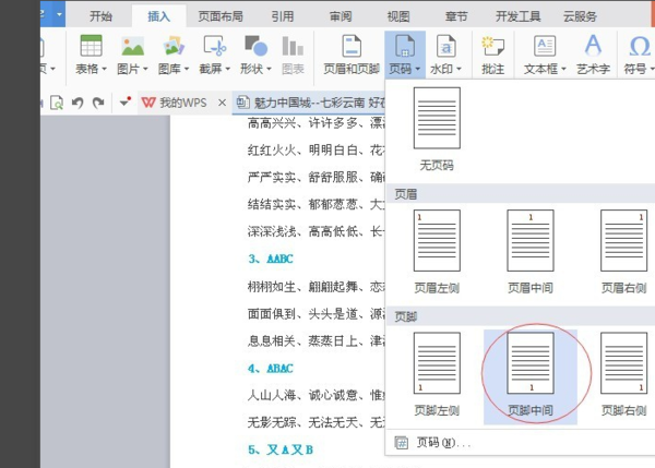 2、可以选择页码添加的位置,比如加在页眉部分或者加在页脚部分,根据自己喜好选择,这次我选择页脚的中间位置。