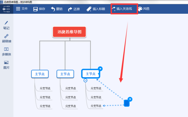 5、选中需要添加关联线的两个节点之一,点击上方的“插入关连线”,即可延伸出一条关连线,链接到另一个节点I即可;